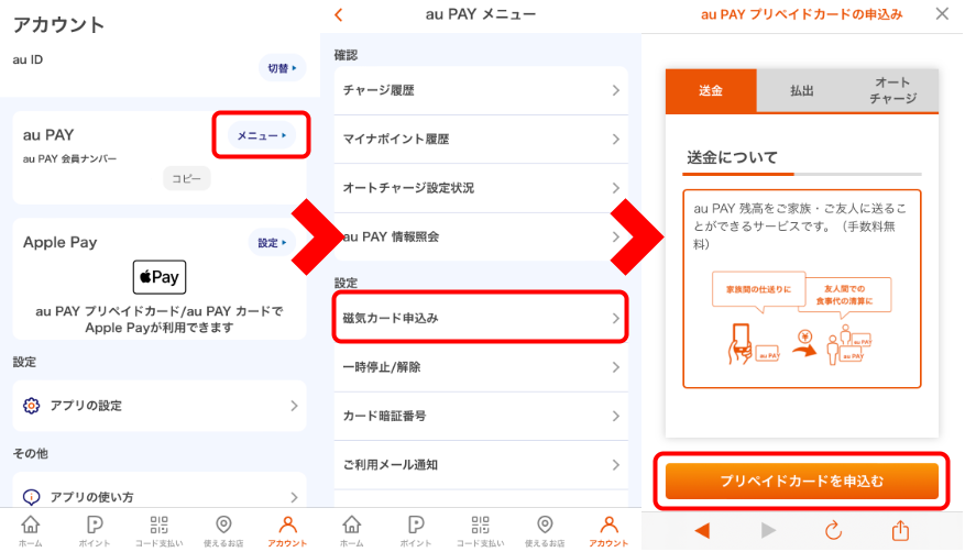 - アプリから「au PAYプリペイドカード」に申し込み